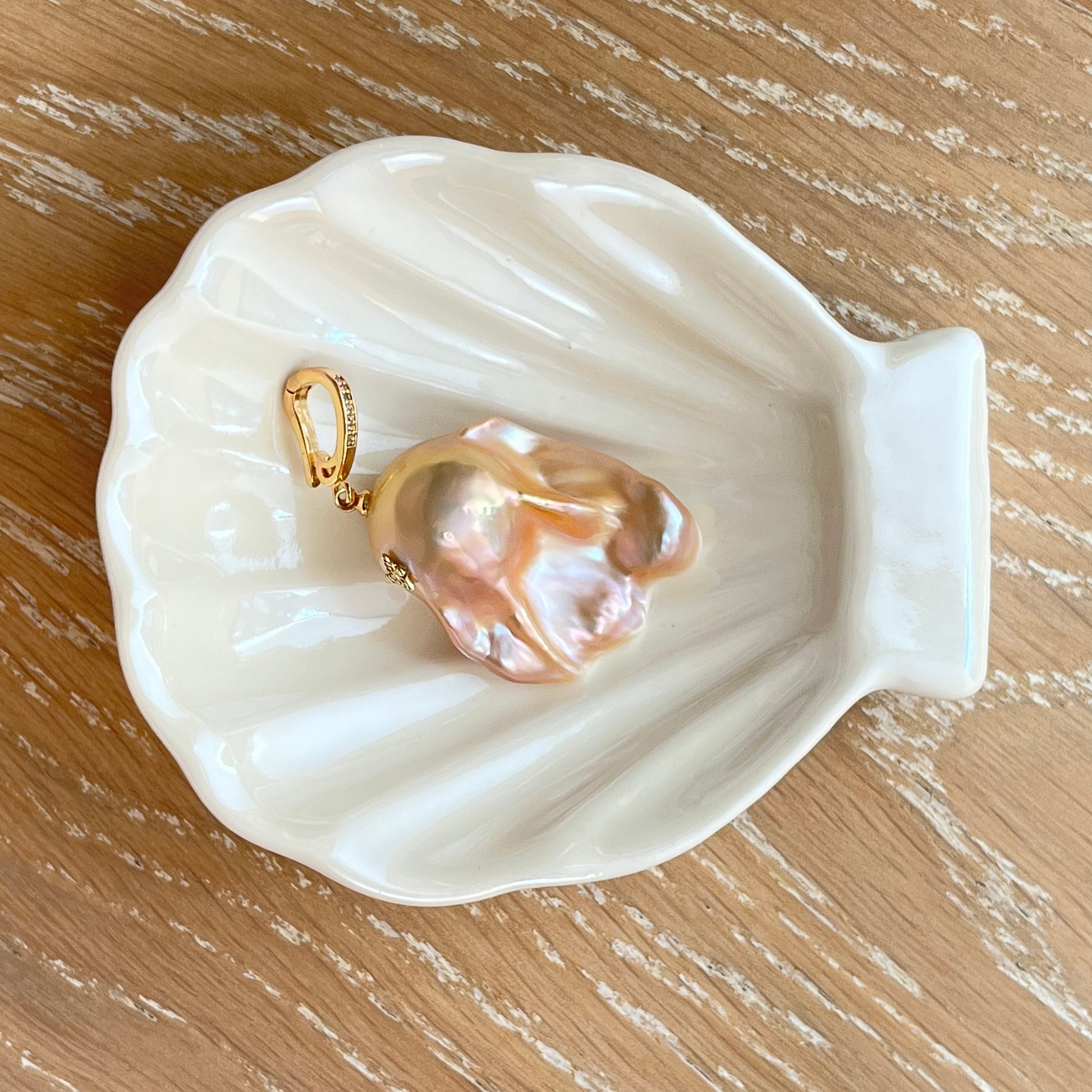 This stunning baroque freshwater pearl, measuring 36mm, stands out with its thick nacre and gracefully flowing shape, reminiscent of a swaying skirt. Its warm, soft orange body radiates a gentle glow, highlighted by subtle golden tones and shimmering blue-purple overtones, creating a mesmerizing play of colors under different lighting.