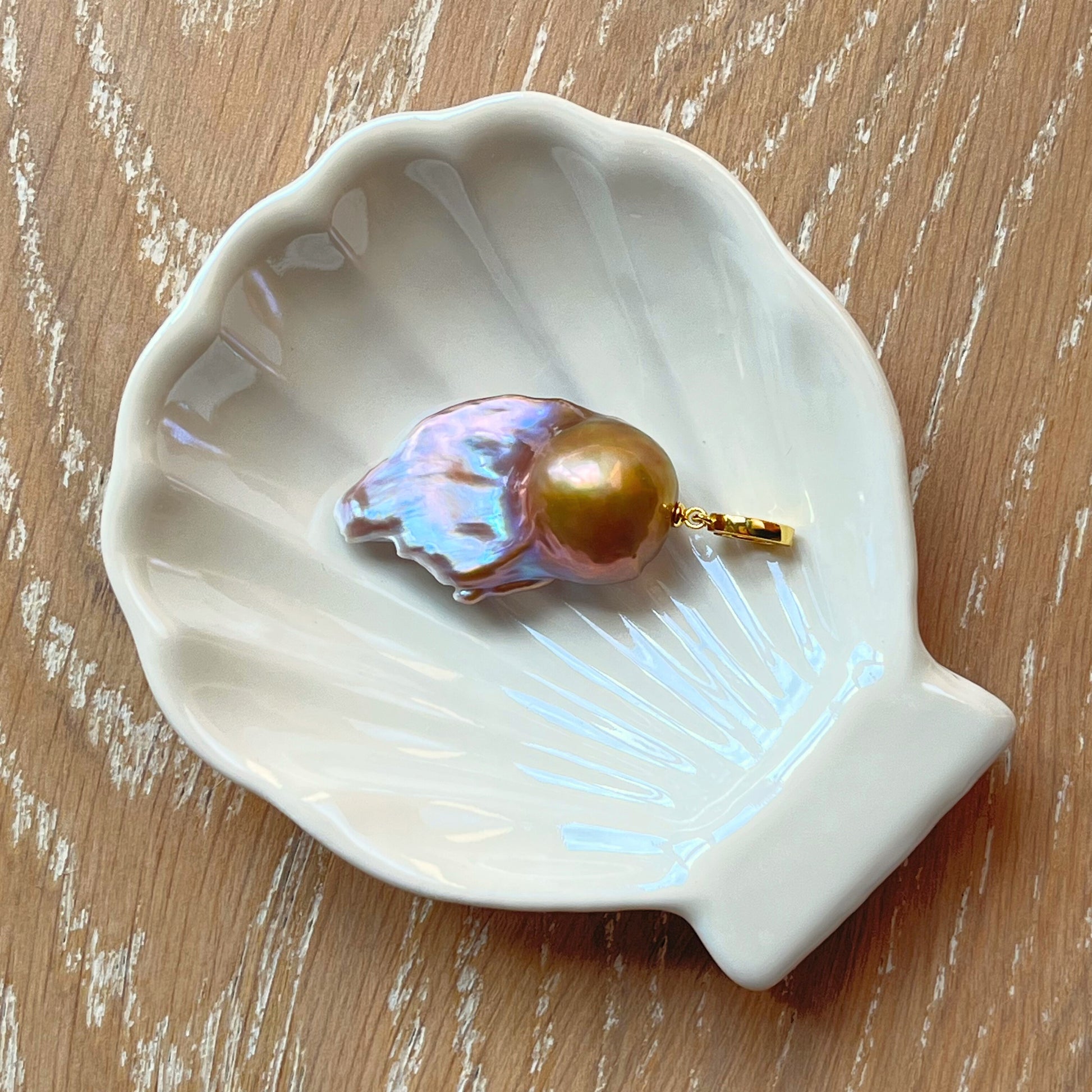 This striking 36.3mm medium-sized baroque freshwater pearl showcases a captivating antique bronze base tone that exudes a sense of vintage elegance. The tail shimmers with rich blue-purple hues, adding a vibrant contrast to the pearl’s warm, earthy body.