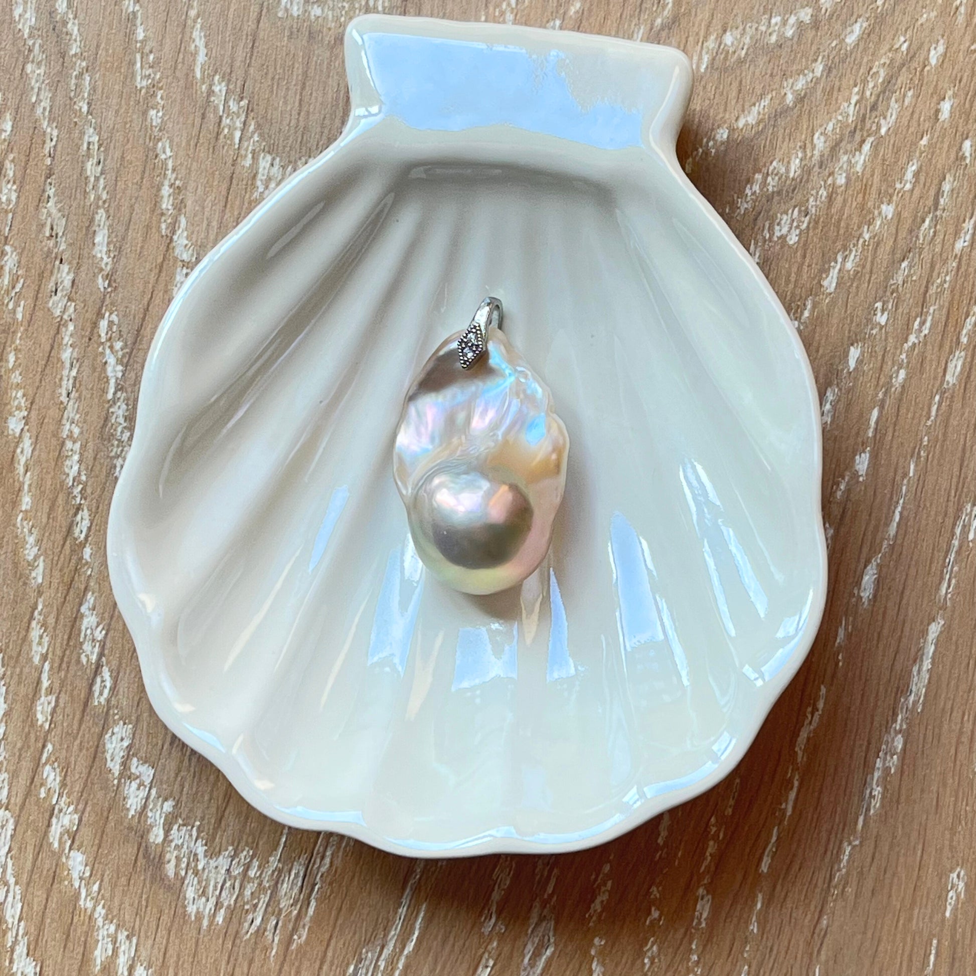 This medium-sized 31mm baroque freshwater pearl radiates a soft champagne gold hue, exuding an understated elegance. The rounded belly is enhanced with a subtle apple-green pearlescent glow, while the petite tail shimmers with hints of orange-pink and blue-violet overtones, creating a dynamic and sophisticated look.